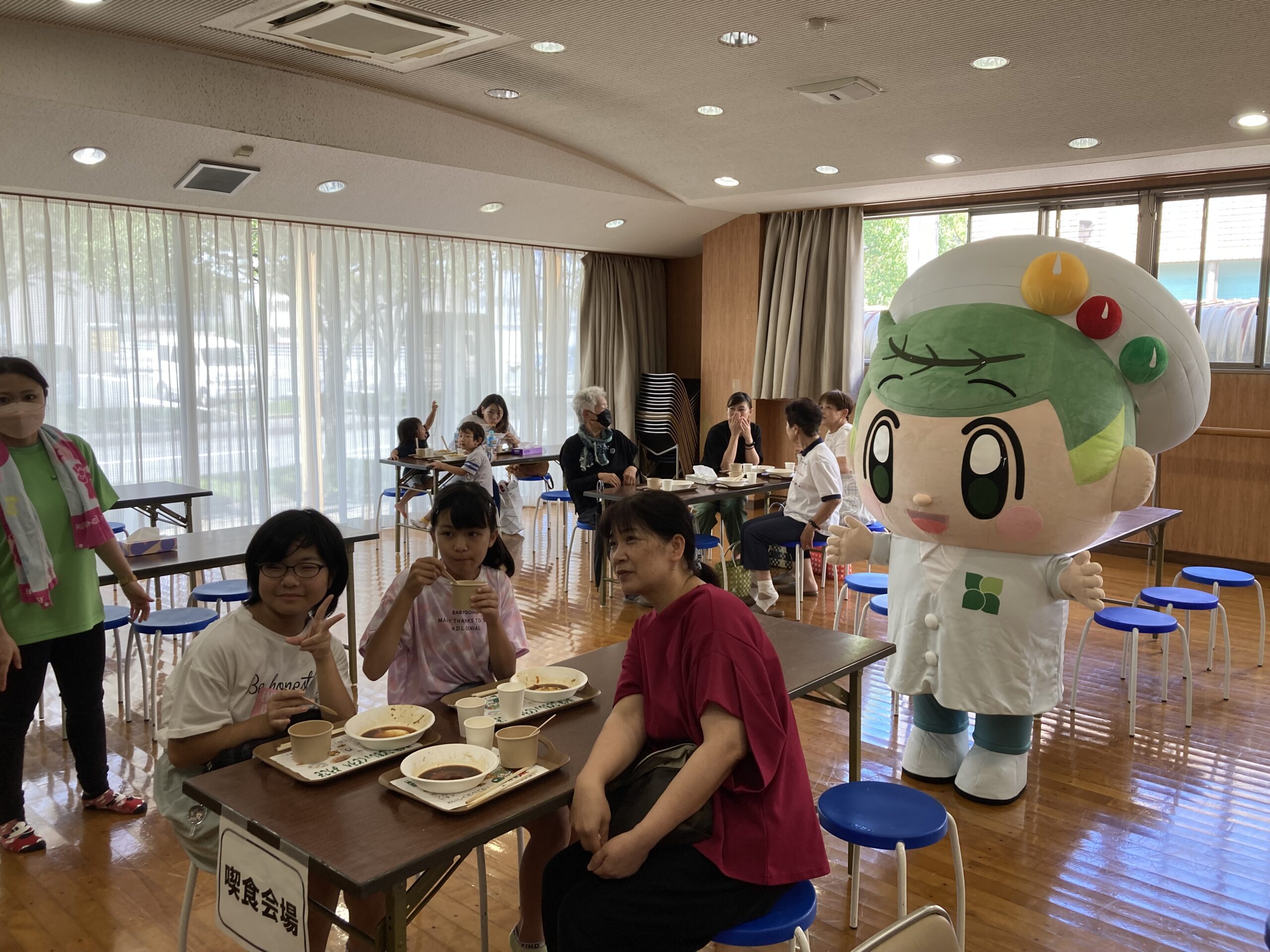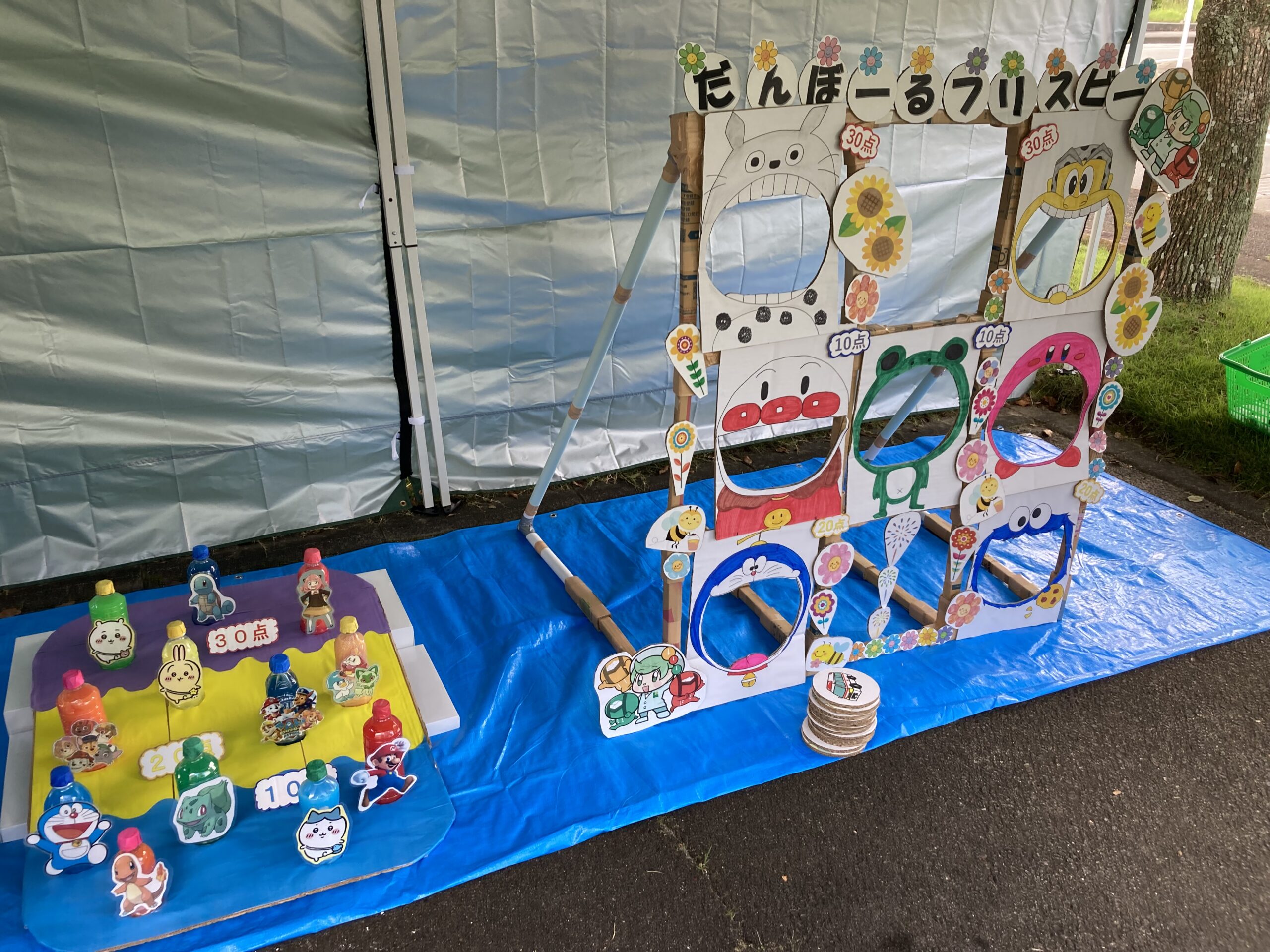 地域の皆さんに喜んでもらえるように、「こども食堂」の他に玩具や花火セット、お菓子などが当たる「ガラガラ抽選会」、従業員が持ち寄った賞味期限の近い食品や使わなくなった文房具や本を無償提供するフードドライブ「つかってなぁ市場」、お菓子が当たる輪投げやフリスビー投げの「ゲームコーナー」を開設、また社会福祉法人 まつさか福祉会のお菓子工房Mさんにも出店してもらい、フェスティバル形式で開催しました。