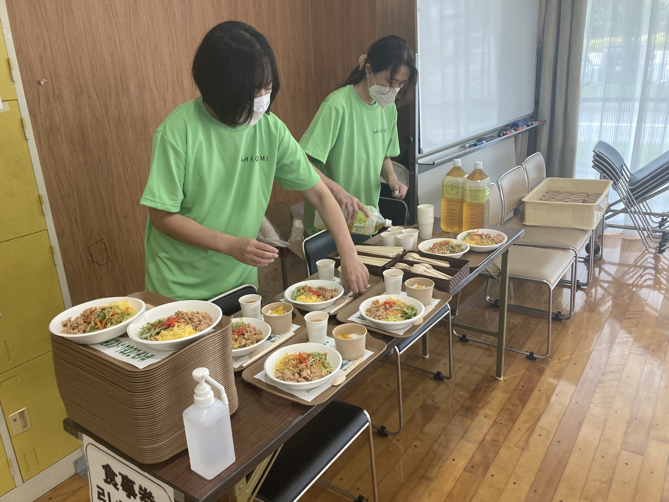 こども食堂では、丸井食品様より贈呈して頂いたたまり醤油冷やし中華スープを使用した、冷やし中華とフルーツ杏仁を提供。