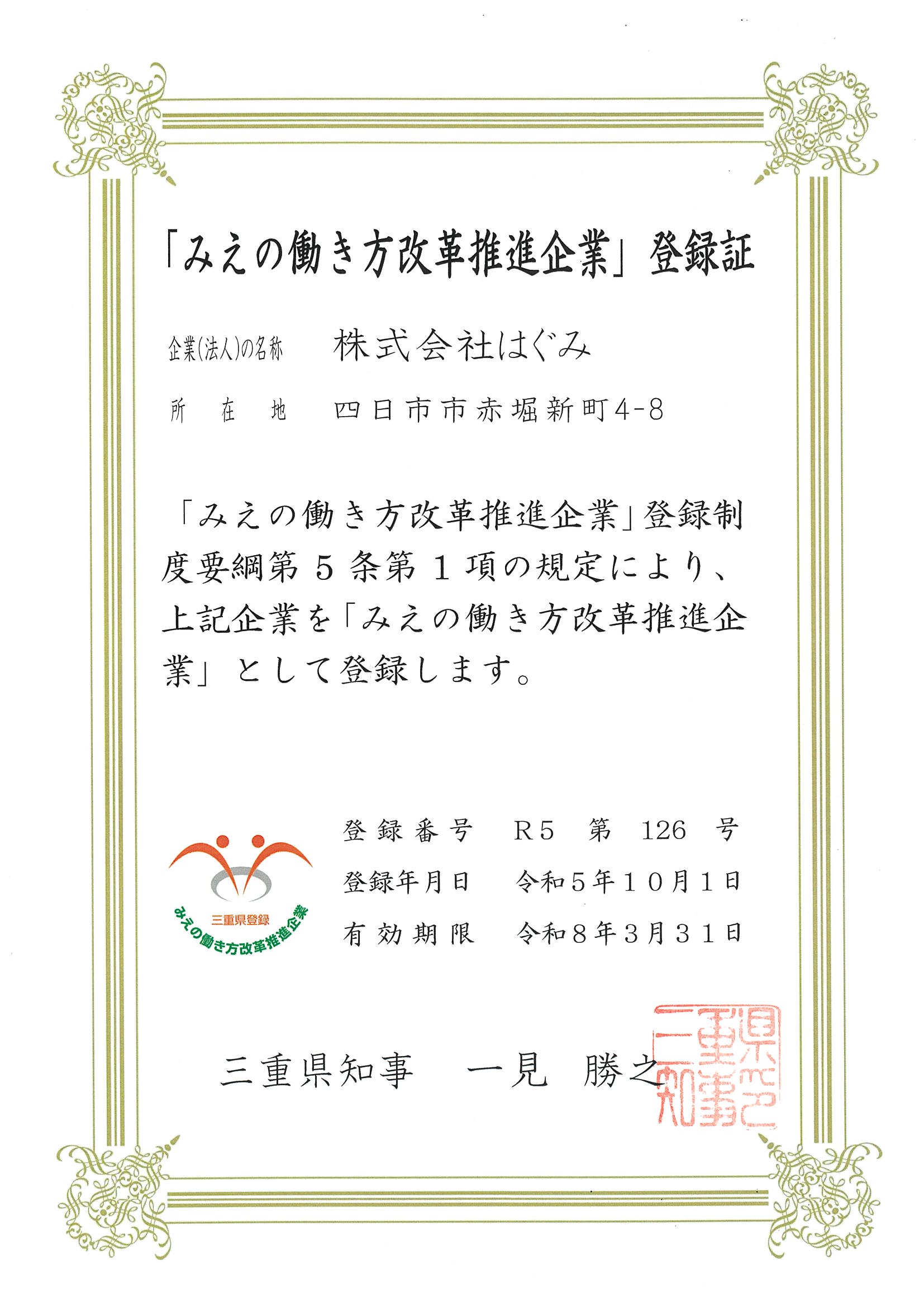 はぐみは、今年度「みえの働き方改革推進企業」として登録されました!これからも働きやすい企業を目指して取り組んでいきます。