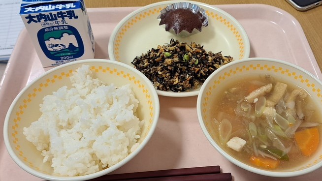 ごはんひじきそぼろのっぺい汁米粉のココア蒸しパン