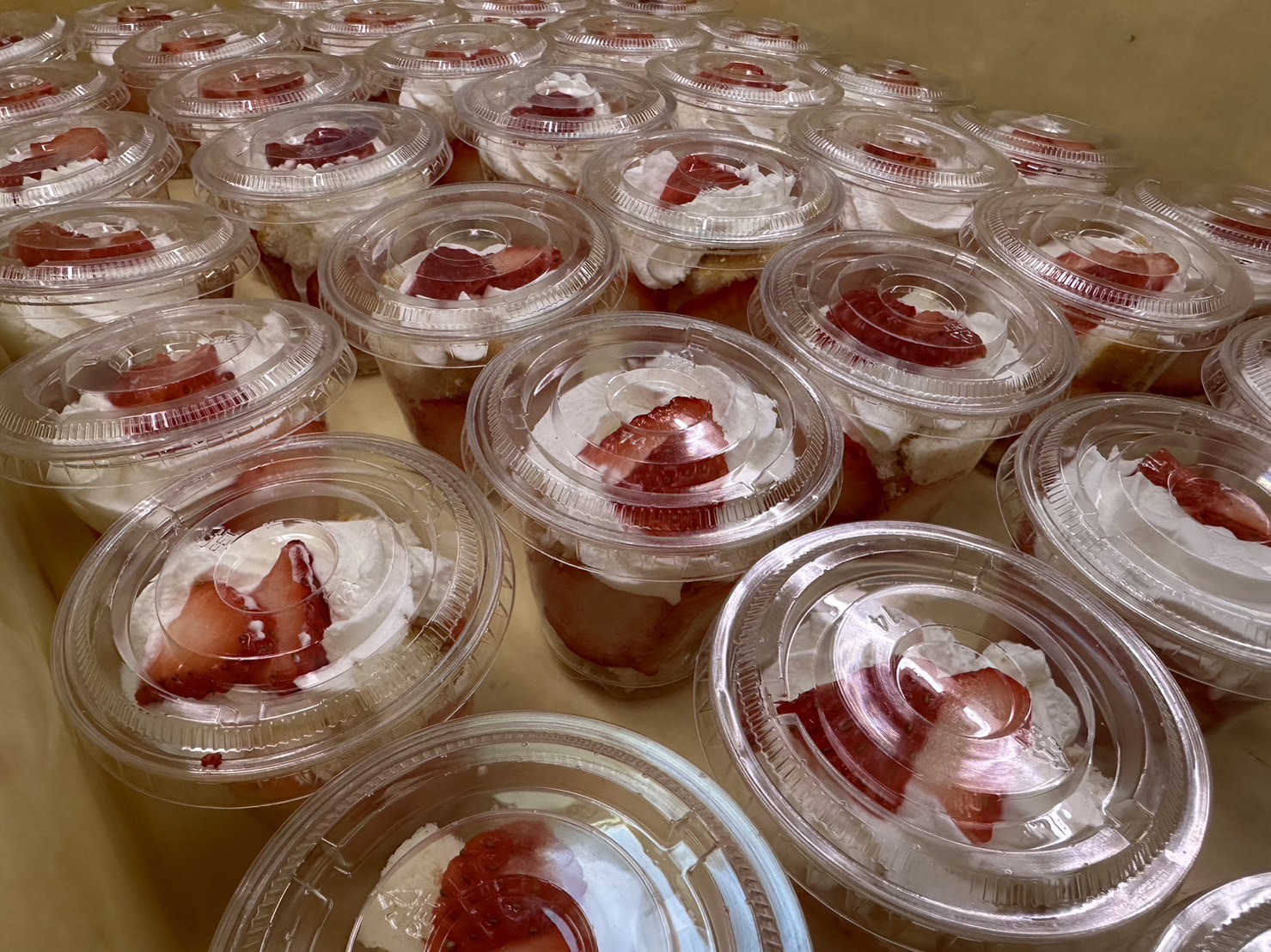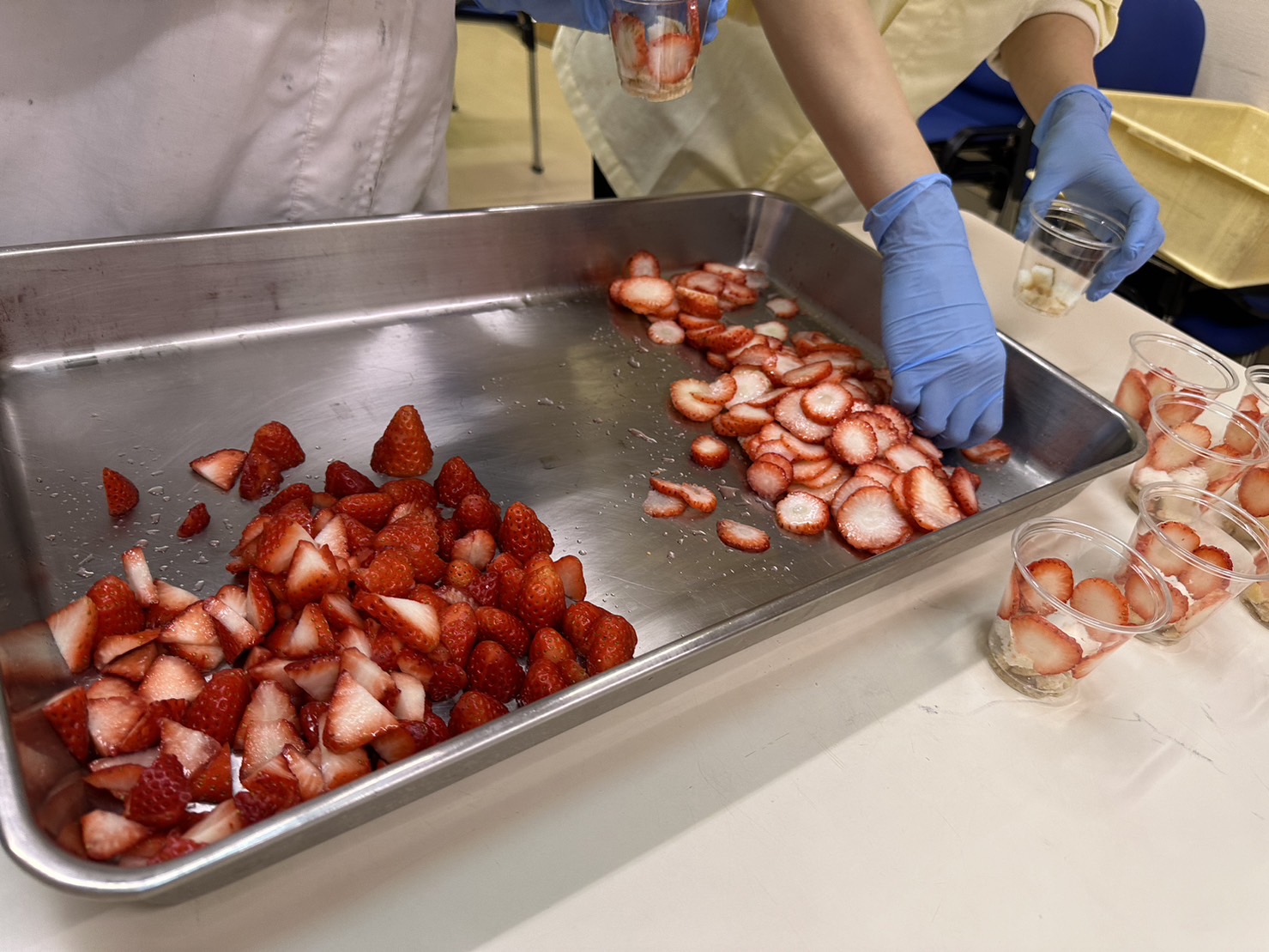 今回はいちご、黄桃、スポンジケーキ、ホイップクリーム、クッキーを重ね入れて作りました🍓