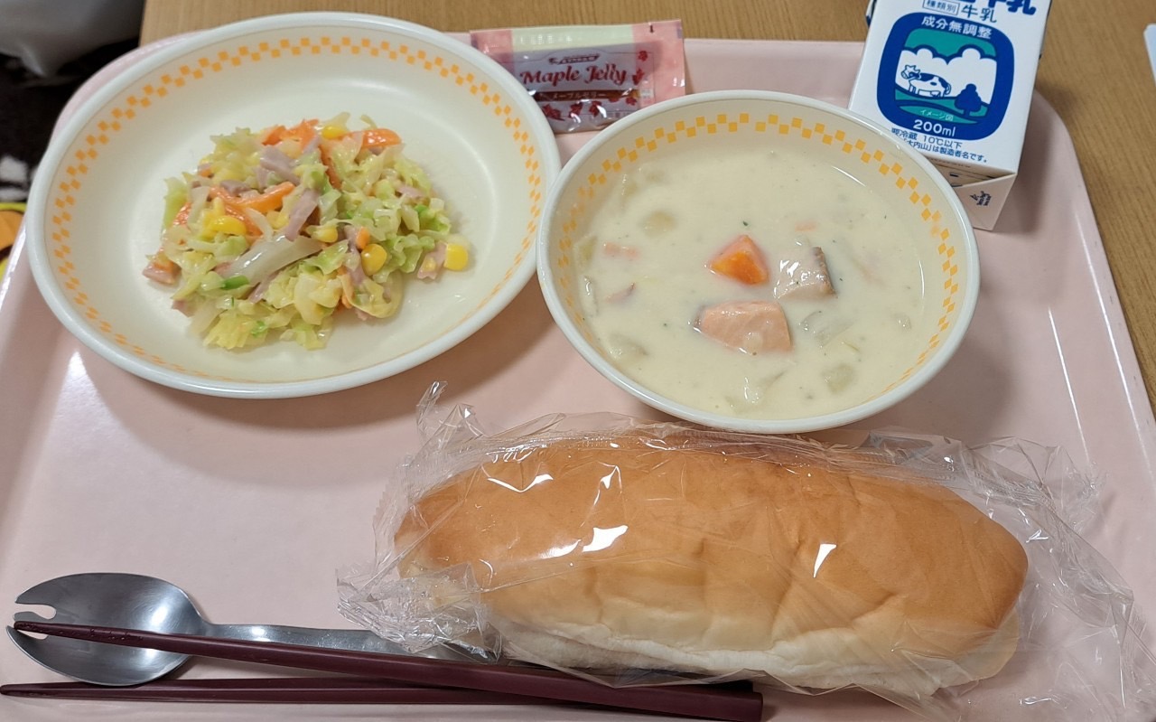 フィンランド料理のサーモンスープは中学校では鮭の臭みを抜くために一度スチコンで蒸してからスープに入れました。斎宮小学校では白ワインをしっかり使い少しでも臭みを取る努力をしました!子供たちからも、今までのスープの中で1番おいしかった!また食べたい!と大人気でした(*^^*)