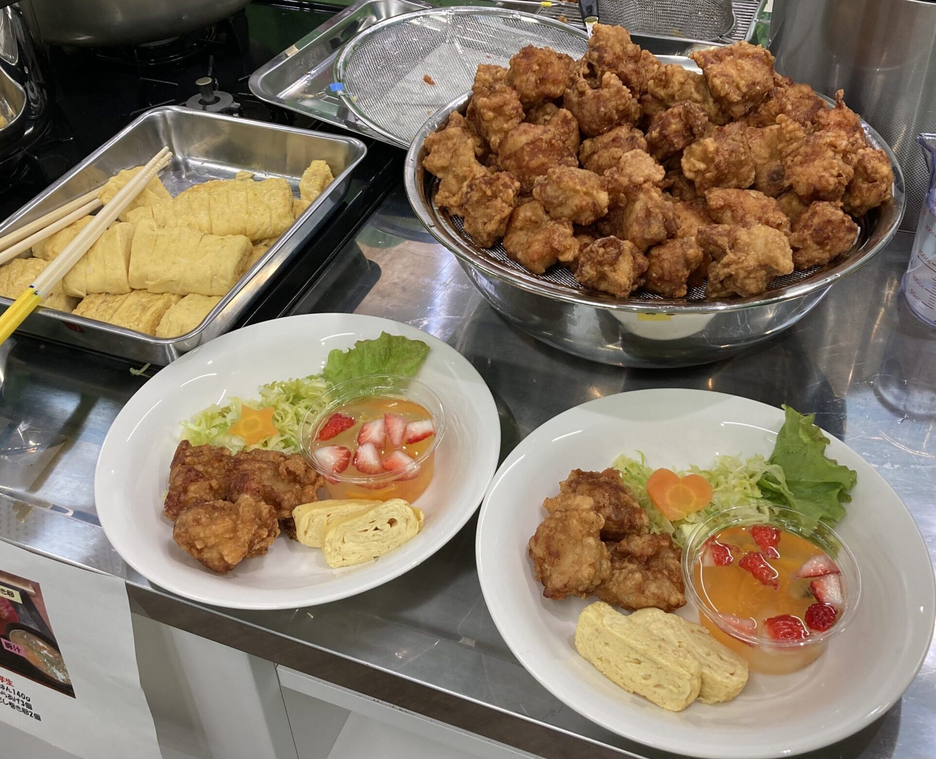 ごはん、からあげ、だし巻き卵、サラダ、豚汁、フルーツポンチ✨