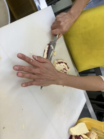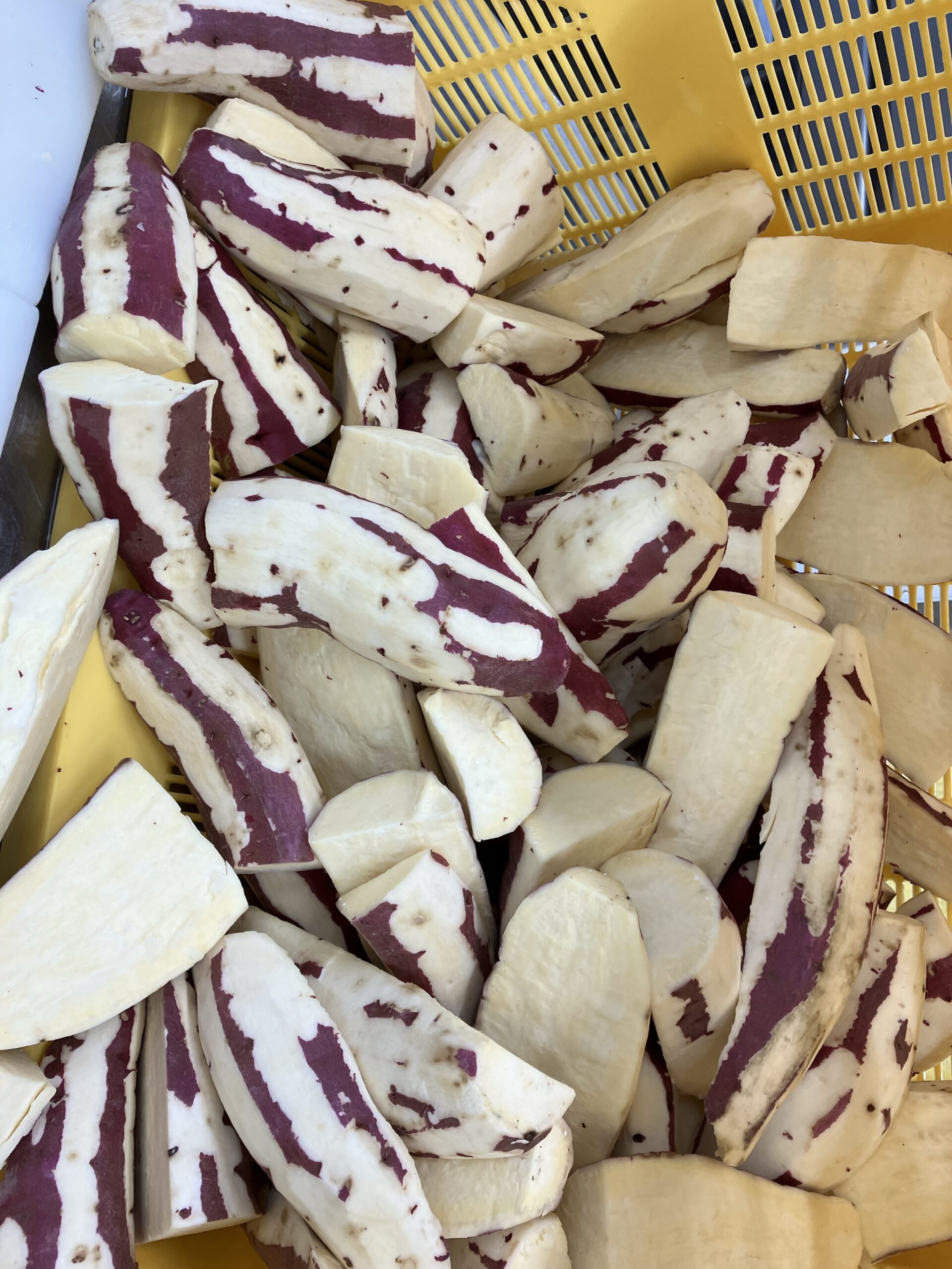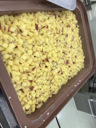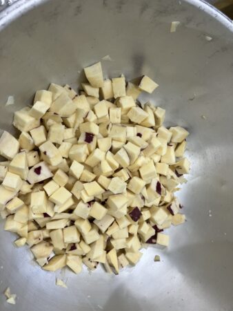 大量のさつまいもを手切りで1センチ角に切って、お米と麦と一緒に炊飯し、さつまいもご飯を作りました🍠!さつまいもを切るのは大変でしたが、炊き上がりはとても甘く美味しい色鮮やかなさつまいもご飯が出来上がりました🍚またうさぎハンバーグやお月見汁で、十五夜の気分を味わってもらえたかな?っと思います🌞