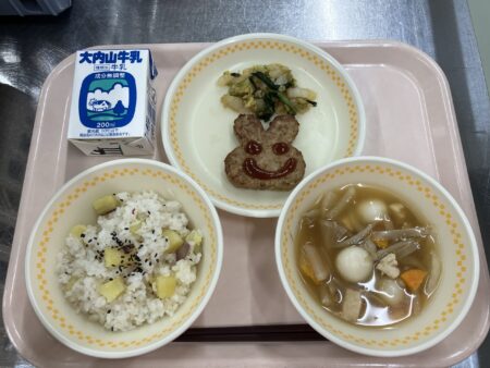 10月6日(月)明和中学校様の献立は、十五夜メニューでさつまいもご飯牛乳うさぎハンバーグおかか和えお月見汁です!🎑