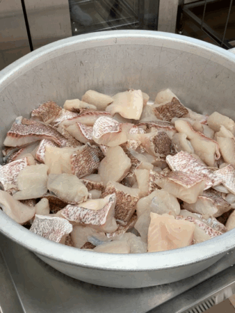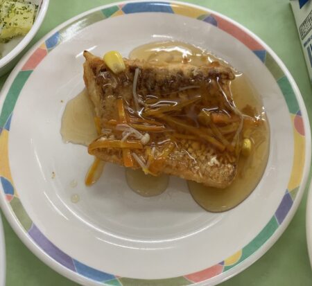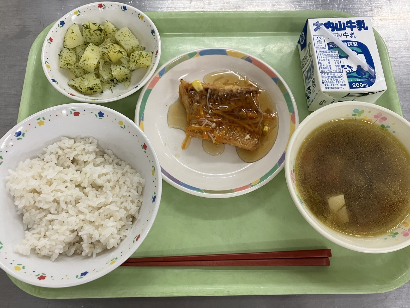南伊勢町様の小学校給食の紹介です!✨ゆた海給食✨献立・麦ご飯・南伊勢マダイの天ぷら(野菜あんかけ)・ジャガイモのスジ青のり和え・こだわりカツオ出汁の具沢山汁