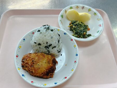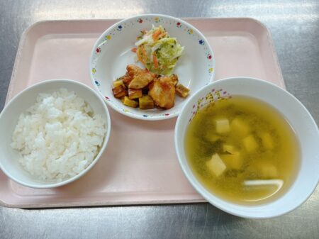 給食の献立に鶏肉とさつま芋の甘唐揚げを入れました😊