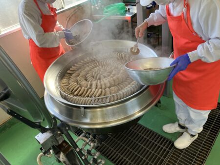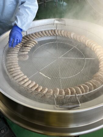 蒸しあがった後、従業員が釜を囲いハンバーグを数えていき、ソースをかけて完成です👍