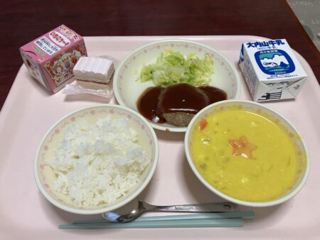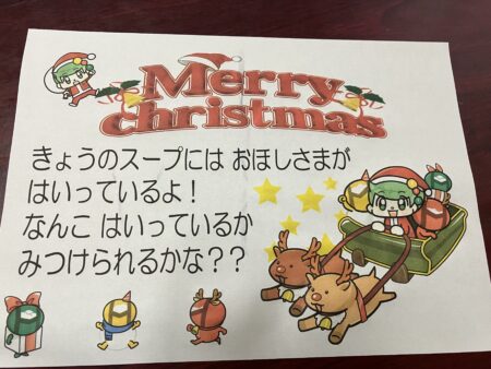斎宮小学校は22日が給食最終日なので、クリスマスメニューとしてかぼちゃを使ったスープ、ハンバーグにキャベツを添え、デザートにクリスマスケーキを提供しました🍰🎄