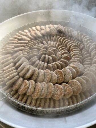 当校はスチコンがないので釜に網を置きハンバーグを並べて蒸していきます。