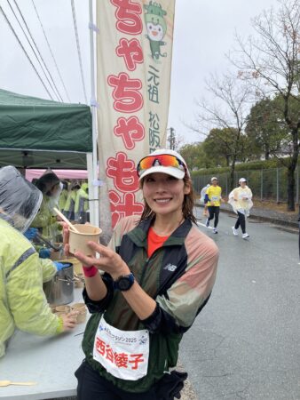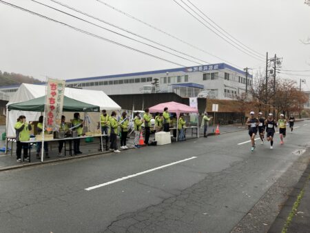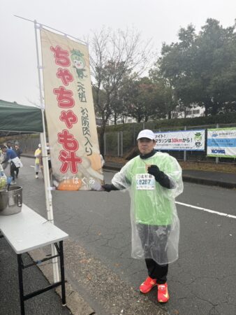 30km地点でランナーの方々に、少しでも身体を温めてもらえる様にちゃちゃも汁のスムーズな提供と、完走できるようにエールを送りました!