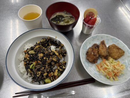 ひじきそぼろ丼、ぶりのからあげ、白みそ汁、デザート🍓