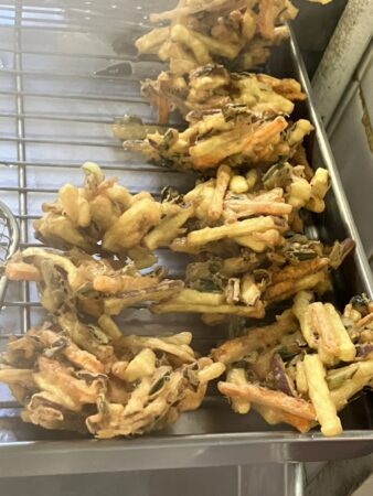 がねは太めの千切りにしたさつまいもとにんじん、玉ねぎ、ニラに醤油などの調味料を入れた衣を作ってかき揚げのように仕上げます。