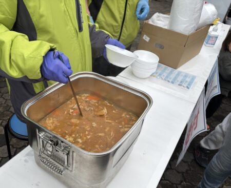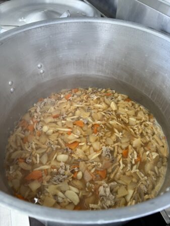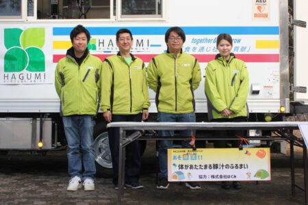 今回、はぐみでは移動式厨房設備キッチンカーで限定100食の豚汁を皆さんに振る舞いました。
